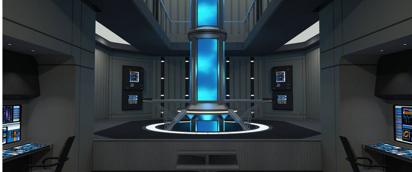 Collected in a briefing room, the crew decides to use the deflector dish to blast the nebula with near the sum-total energy generated by their warp engines, itself powered by a controlled matter/antimatter explosion).